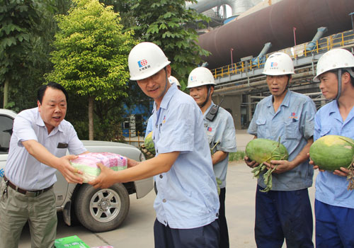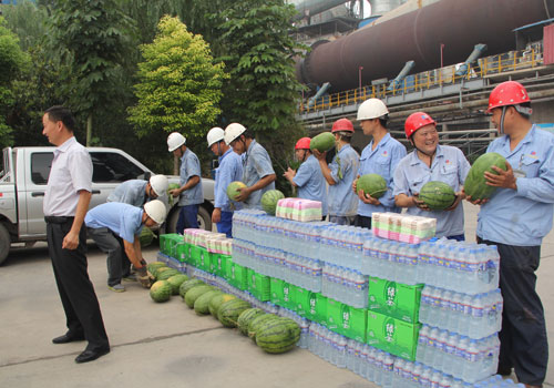 7月21日上午,县总工会主席郭鹏飞带领县总工会部分工作人员到大地集团看望慰问一线职工,送去了矿泉水、绿茶、西瓜、毛巾等防署降温用品,为广大职工送去了夏日的清凉。图为郭鹏飞主席亲自为职工发放慰问品。