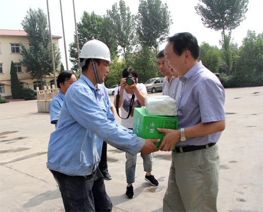 7月13日上午,在县总工会主席郭鹏飞的带领下,县总工会“夏送清凉”活动组一行来到大地公司,送来了西瓜、矿泉水、绿茶、毛巾等防暑降温用品,县委常委、宣传部长李庆豪,集团总裁崔泉发等领导参加活动。 丝丝清凉,浓浓情谊。县总工会“夏送清凉”活动为大地公司职工送来亲切的慰问和夏日的清凉,让广大职工感受到了党和政府的关爱,从而鼓舞了员工士气,激发了员工的工作热情。大家纷纷表示,要提振信心,奋战酷暑,确保顺利完成各项目标任务,为企业的发展作出积极的贡献。