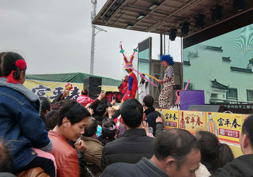 美酒当纵歌,划拳论英雄。“富平春杯”拳王争霸正在激情上演,吆五喝六的酒令,代表着一种有趣的酒文化,引得众多父老乡亲的积极参与和蜂拥而至的围观人群,场面盛大,气氛热烈,此伏彼起的掌声、笑声、欢呼声响彻整个会场,成为马街书会一道独特的风景线。为了活跃现场气氛,贾湖酒业还准备了精彩纷呈的节目,戏曲歌舞摇滚魔术轮番上阵,更有嘻哈大师、滑稽小丑前来助兴,用气球现场编织出各种小动物送给小朋友们。同时,扑克牌、吉祥物、打火机等精美礼品,引来大家的疯抢。