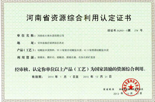 河南省资源综合利用认定证书